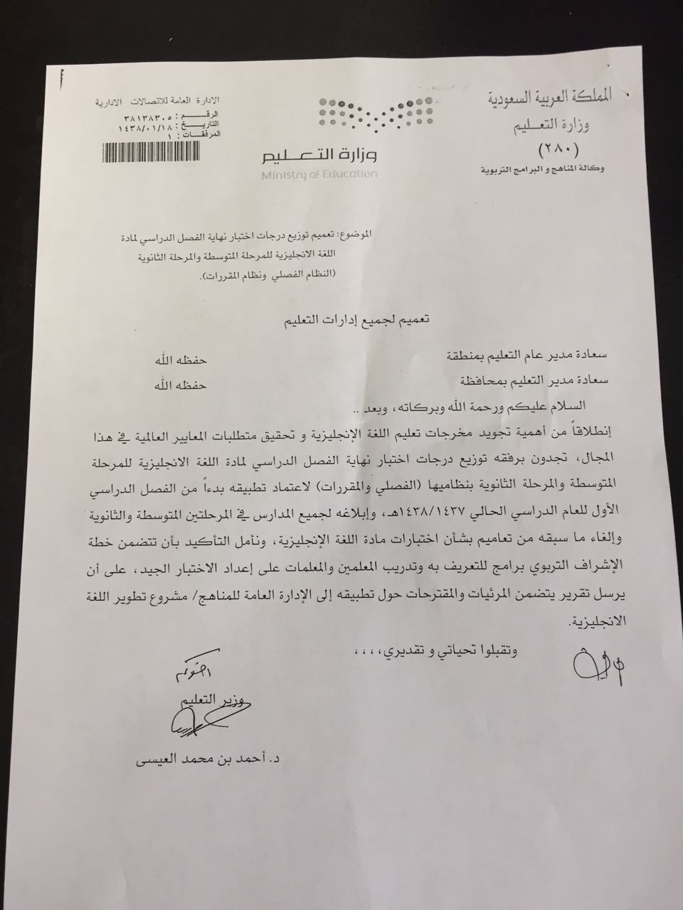 تعميم آلية توزيع درجات الاختبارات في المرحلة المتوسطة والثانوية بلبل انقلش
