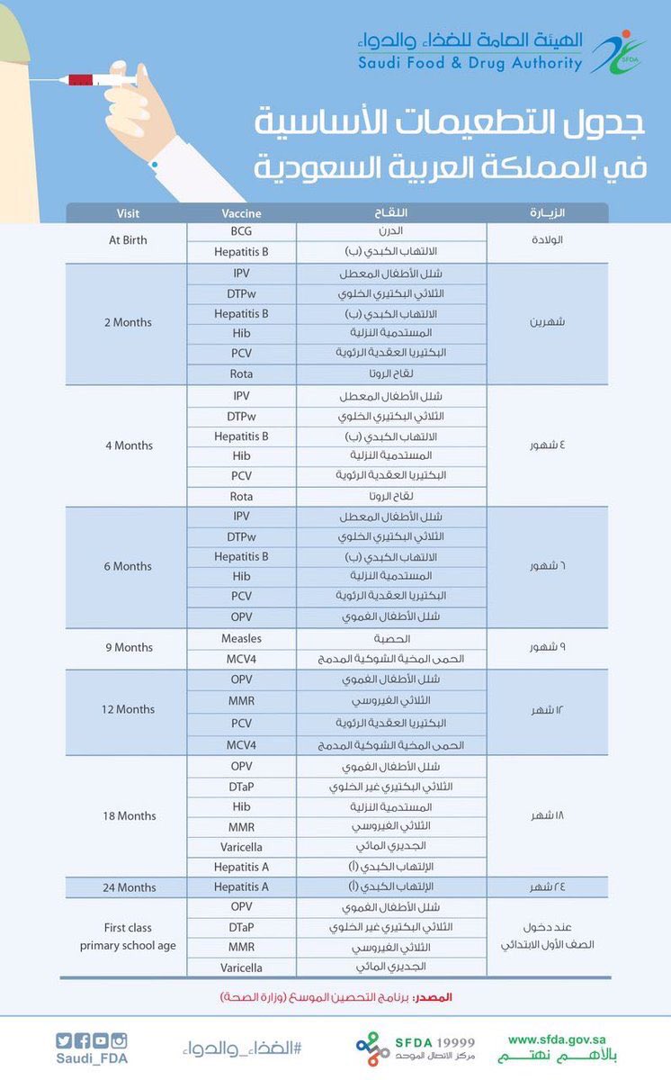 و ز ا ر ة ا لـ صـ حـ ة السعودية Na Twitteru Asm 1 نرحب بك يحتوي جدول التطعيمات الأساسية على تطعيمة الحمى الشوكية لعمر تسع شهور تفضل الرابط Http T Co Erbn7urzkb