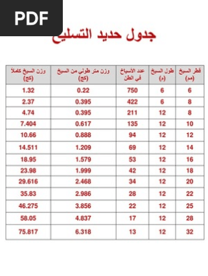 جدول حديد التسليح. جدول أقطار وأوزان ومساحة مقطع حديد التسليح free download as excel spreadsheet xls pdf file pdf text file txt or read online for free. Scribd is the world s largest social reading and publishing site. حديد التسليح هو قضبان الصلب التي يتم توفيرها في تركيبة مع الخرسانة الاسمنت عادي لجعله الخرسانة المسلحة و من هنا تشكل هذه الهياكل هيكل خرساني من الأسمنت المسلح rcc. للمحافظة على حديد التسليح بشكل جيد يجب إتباع الآتي.