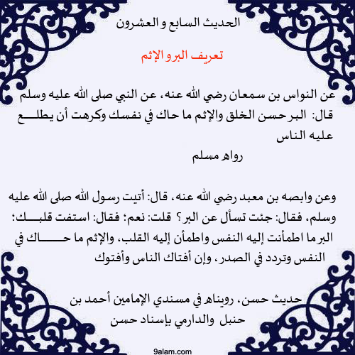 الحديث السابع والعشرون من احاديث الأربعين النووية عن النواس بن سمعان رضي الله تعالى عنه عن النبي صلى الله عليه وآله وسلم قال البر Ahadith Words Hadith