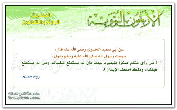 الحديث الرابع والثلاثون عن أبي سعيد الخدري قال سمعت رسول الله صلى الله عليه وسلم يقول من رأى منكم منكرا فليغيره بيده فإن لم يستطع فبلسانه فإن لم يستطع