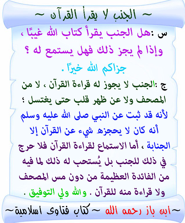 حكم قراءة القران والاستماع له للجنب لابن باز رحمه الله منتديات الإمام الآجري