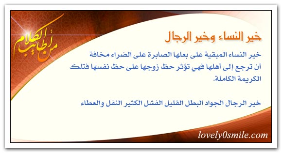 خير النساء لا تفارق بيتها لا يرى منها نعلها و شر النساء تضحك من غير عجب كلامها وعيد طفلها جائع و فرضها ضائع لسانها طو