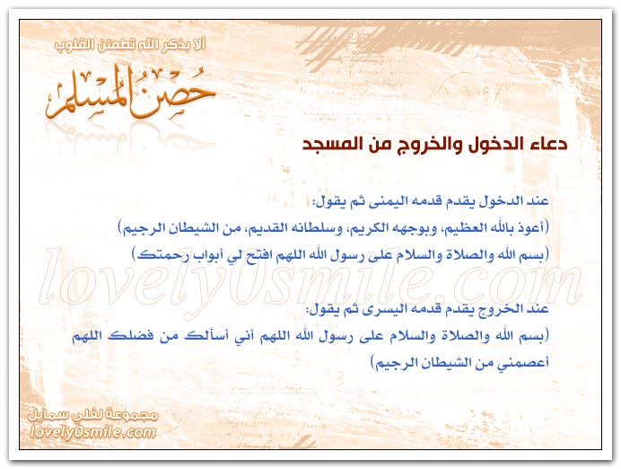 دعاء دخول المسجد وخروجه. دعاء دخول المسجد والخروج منه ع ن أ ب ي ح م ي د أ و ع ن أ ب ي أ س ي د رضي الله عنهما ق ال. دعاء الدخول الى المسجد. أعوذ بالله العظيم وبوجهه الكريم وبسلكانه القديم من الشيطان الرجيم الحمد لله اللهم صلي وسلم على محمد وعلى آل محمد اللهم اغفر لي ذنوبي وافتح لي أبواب.