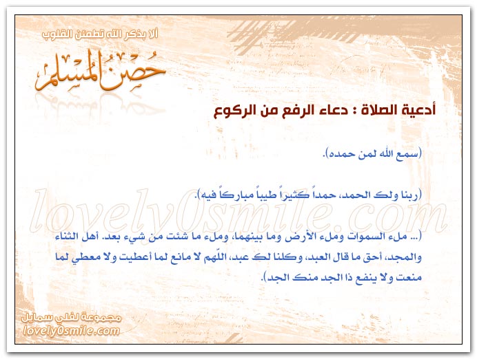دعاء الرفع من الركوع. دعاء الرفع من الركوع و اذكر ربك سمع الله لمن حمده ربنا ولك الحمد حمدا كثيرا طيبا مباركا فيه ملء. حصن المسلم من أذكار الكتاب والسنة. 18 دعاء الرفع من الركوع. أن يقول المصلي.