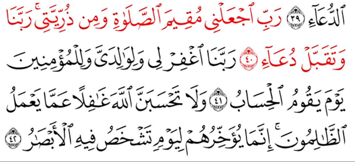 رب اجعلني مقيم الصلاة ومن ذريتي ربنا وتقبل دعاء ربنا اغفر لي ولوالدي وللمؤمنين يوم يقوم الحساب الأدعية